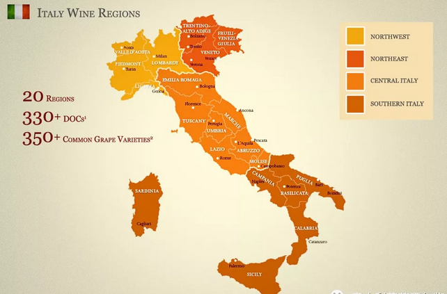 如果一種葡萄并不是以地區的名稱命名的,那么由它釀制的葡萄酒很可能特性不夠鮮明。Denominazione di Origine Contro llata(D.O.C.)是意大利葡萄酒中的最高等級,只有生產最高質量的葡萄酒的地區才能被授予此稱呼。