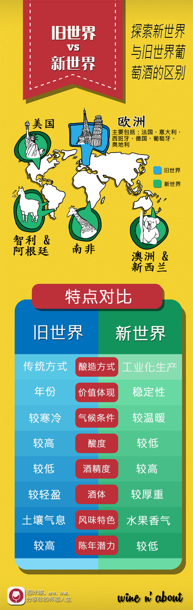 由于歷史、地理、傳統、法規等方面的不同,舊世界與新世界葡萄酒呈現出許多差異;不過,對于真正的葡萄酒愛好者來說,正是這些差別讓葡萄酒世界顯得更加豐富、迷人。