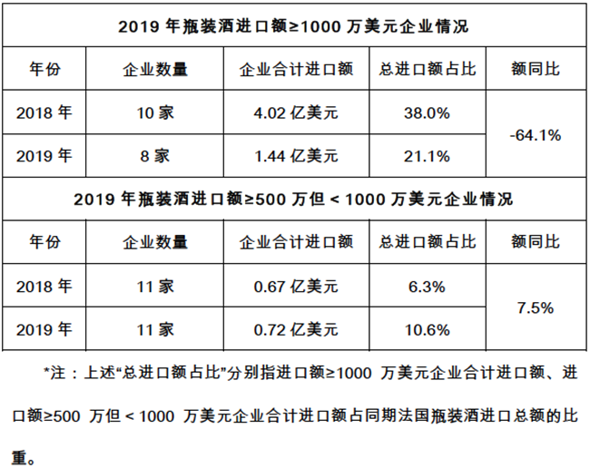 進(jìn)口法國(guó)瓶裝酒頭部企業(yè)(指進(jìn)口額≥500萬(wàn)美元以上的企業(yè))近兩年數(shù)量維持在20家上下,但其2019年進(jìn)口總額,尤其是≥1000萬(wàn)美元企業(yè)的進(jìn)口總額,絕對(duì)值減少近2.6億美元,出現(xiàn)腰斬式銳減(同比-64.1%)。與之形成對(duì)比的是,同期同等量級(jí)的澳洲酒進(jìn)口商數(shù)量增加并超過(guò)法國(guó),且進(jìn)口總額亦實(shí)現(xiàn)超車。