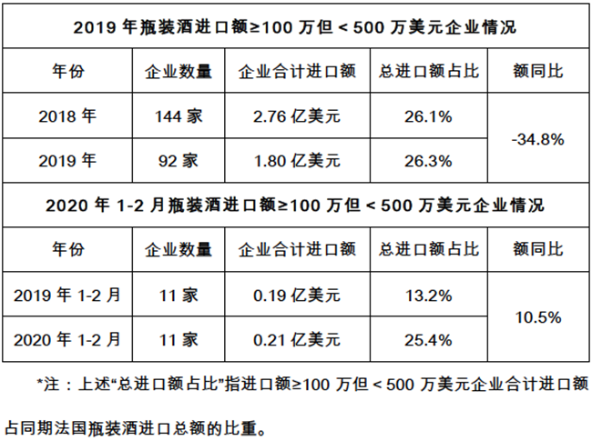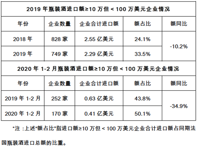 與澳洲一樣,法國(guó)瓶裝酒進(jìn)口商中絕大多數(shù)是小型企業(yè)(指進(jìn)口額≥10萬(wàn)美元但<100萬(wàn)美元的企業(yè))和微型企業(yè)(指進(jìn)口額<10萬(wàn)美元的企業(yè)),并都在今年1-2月疫情影響下家數(shù)減少,且進(jìn)口總額高幅低開。