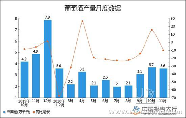 根據(jù)中國報告大廳對2020年1-11月全國葡萄酒產(chǎn)量進(jìn)行監(jiān)測統(tǒng)計顯示:2020年11月全國葡萄酒產(chǎn)量3.6萬千升,同比下降10%,2020年1-11月全國葡萄酒產(chǎn)量為35.9萬千升,累計增長3.8%。