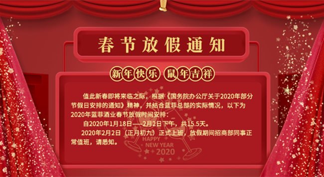 自2020年1月18日——2月2日上午,共15.5天,為藍(lán)菲酒業(yè)春節(jié)假期,于2月2日下午13: 30 (正月初九)正式上班,放假期間公司安排人員正常值班,請悉知。